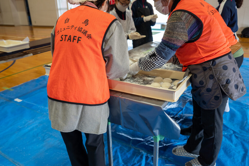 保護者の方にも丸め作業を手伝っていただき、「ぺったん、ぺったん」という音とともに会場は和やかな雰囲気に。