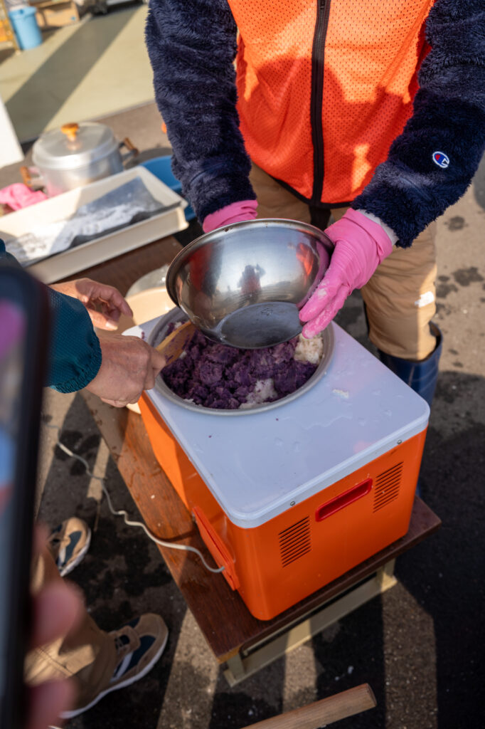 白いお餅、紫芋のお餅、あんこ入りのお餅を持ち帰り、家族で囲む食卓までが学びの時間。